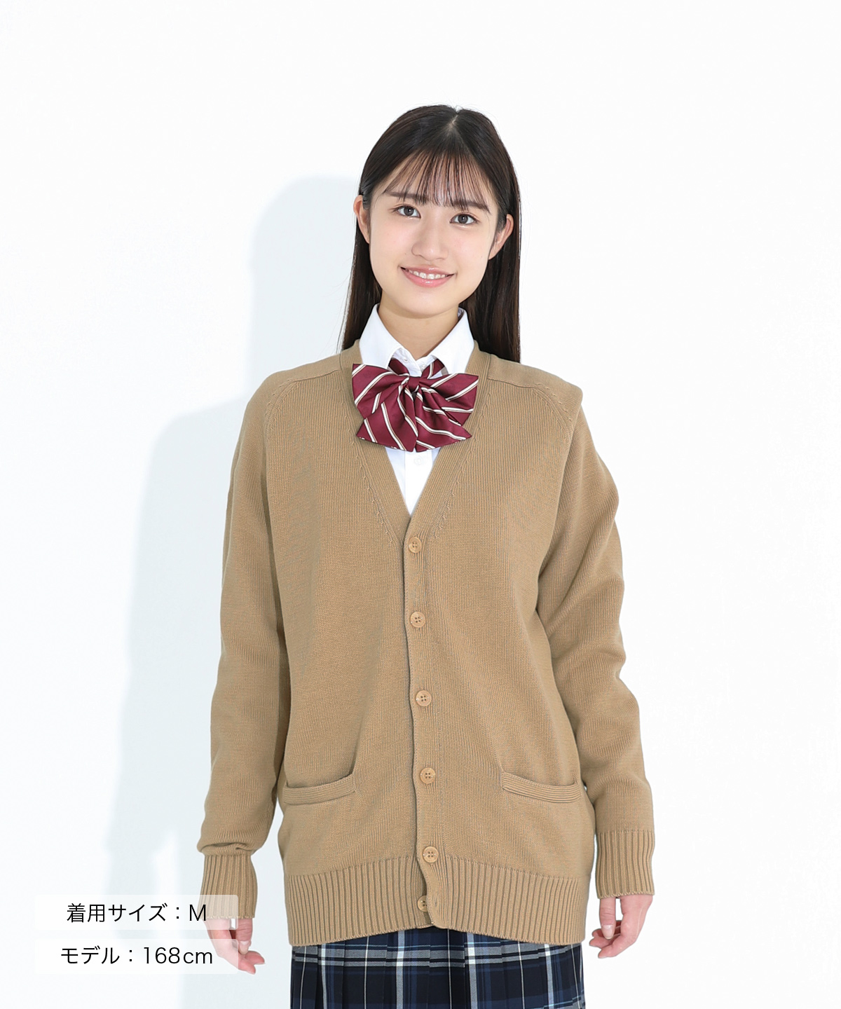 ゆったりサイズのキャメルカーディガンにブルー系スカートは相性抜群。エンジのリボンを組み合わせれば、オシャレ可愛い最強制服コーデに!ユニセックスタイプのゆったりサイズのカーディガン&スカートの4点セットはCONOMi人気商品を使った定番人気コーディネートとなっています。